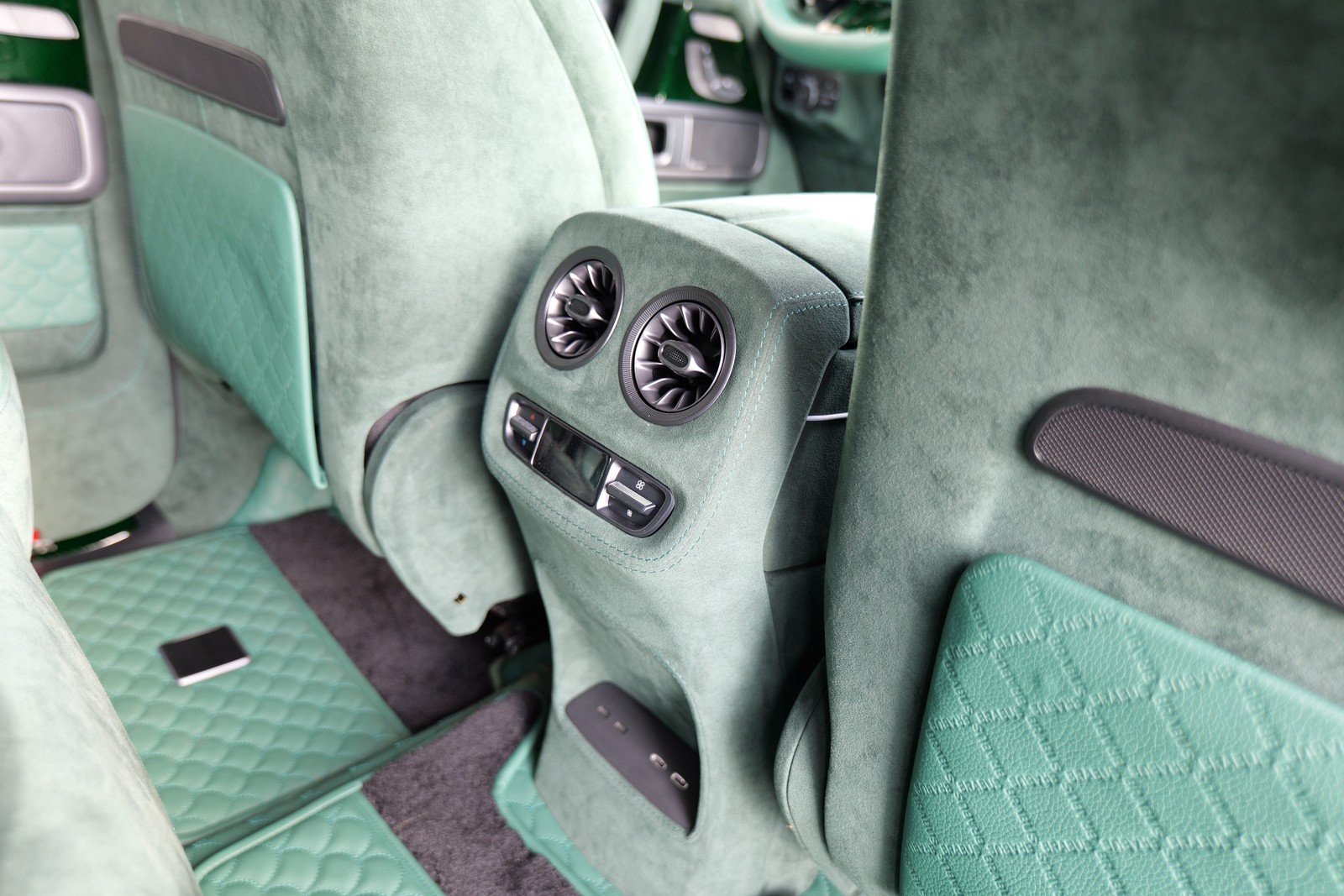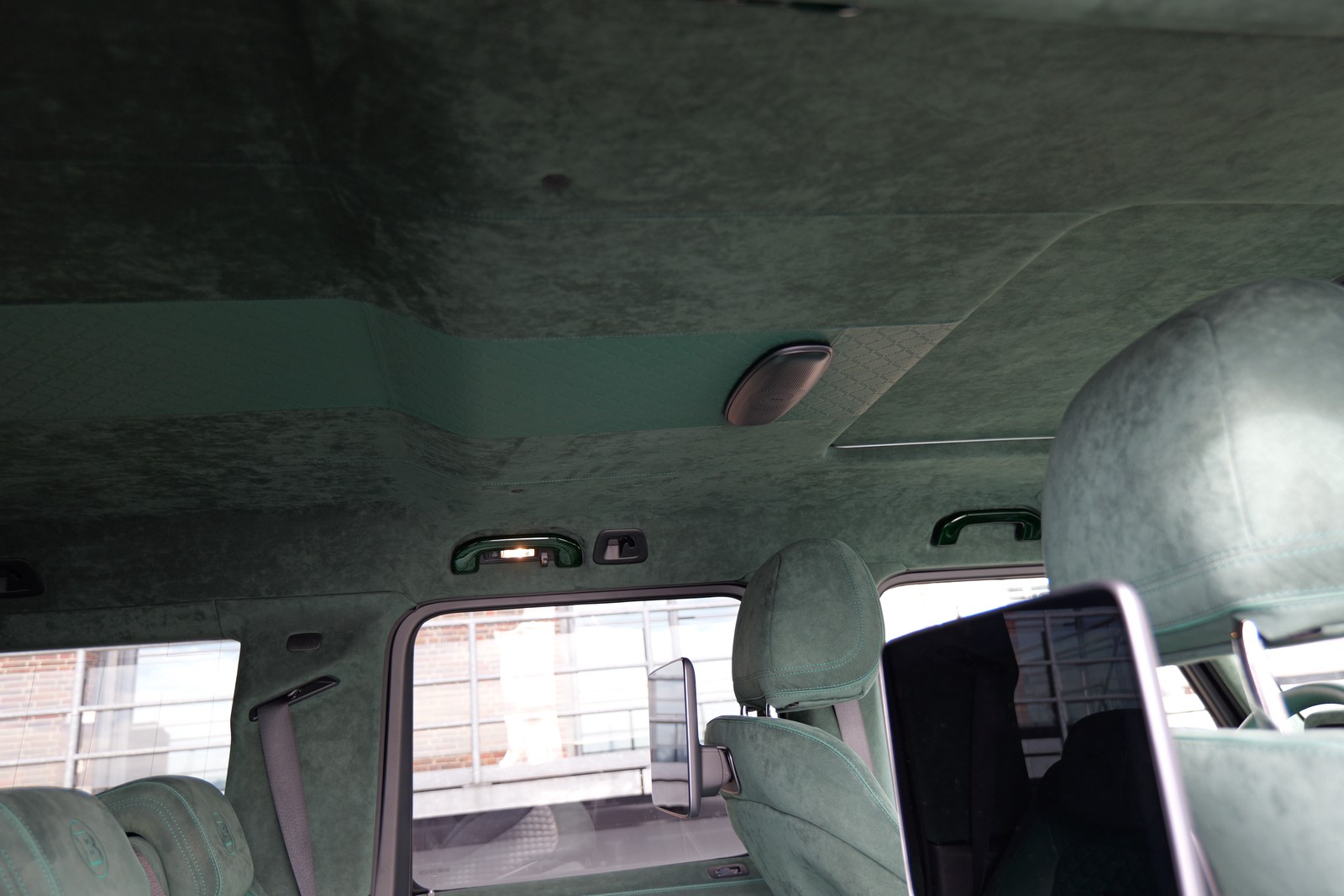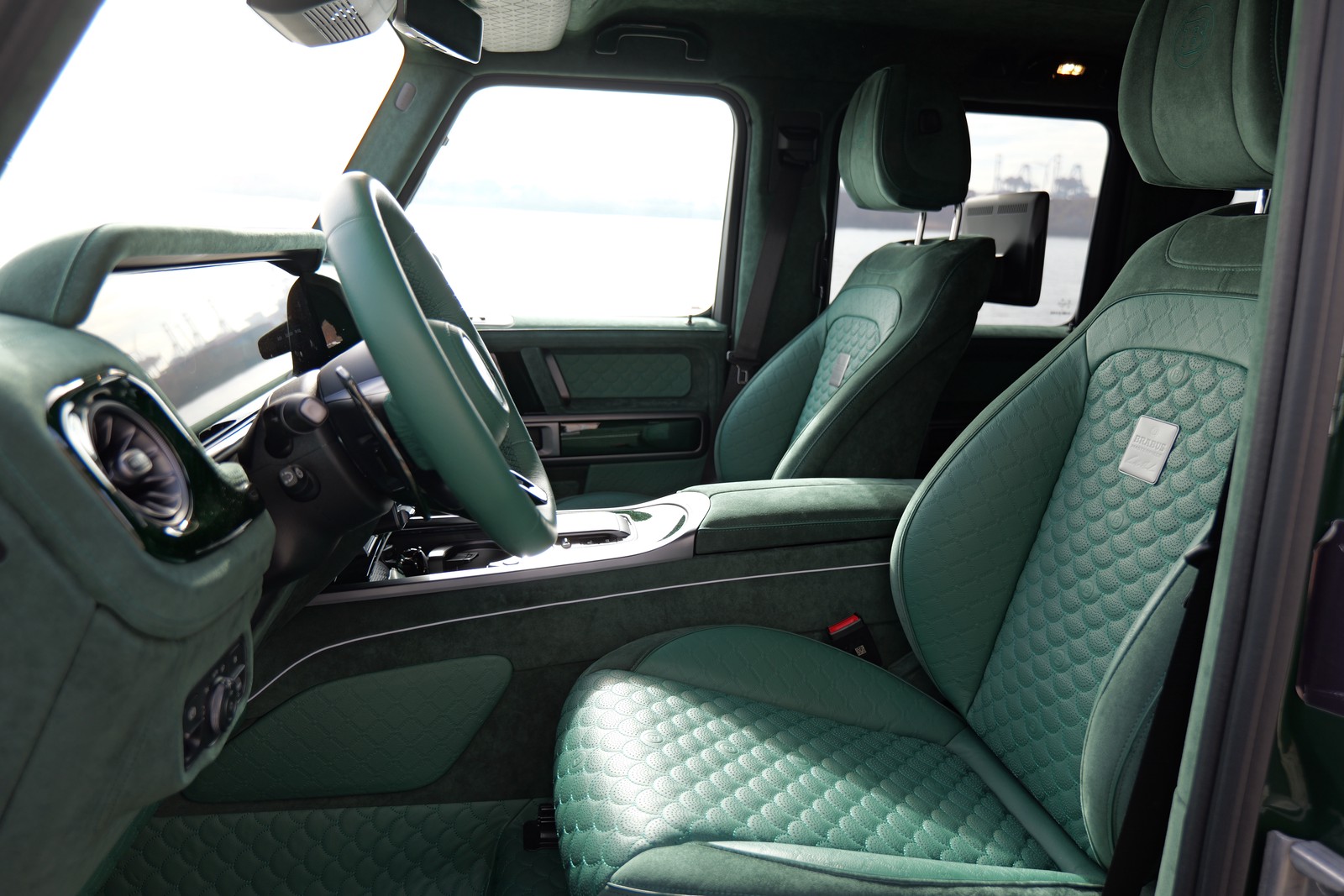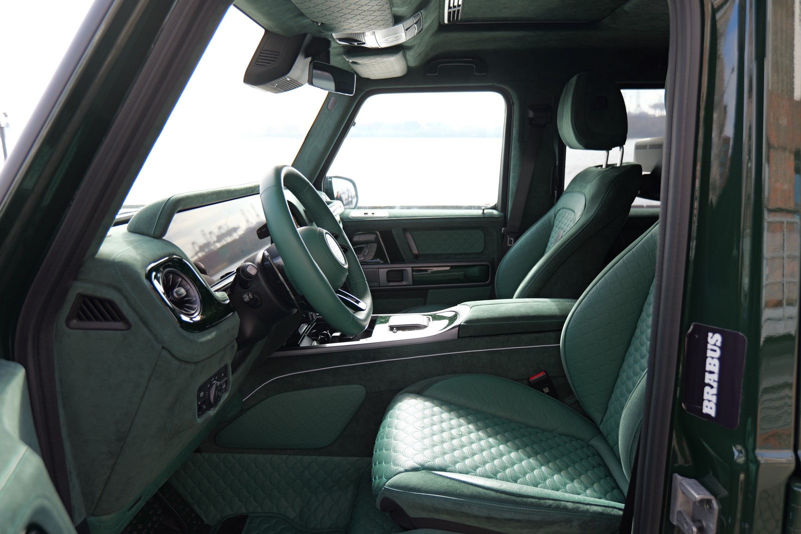 - BRABUS MASTERPIECE INTERIEUR MEAN GREEN Volllederausstattung in individuellem Design und Farbe, Leder: „Opal“ (615), Alcantara:‚Smaragd‘ (9073) Nähte "grün", Biese: „Opal“ (615) und Steppung: "Muschelraute" mit eingeprägtem BRABUS Logo